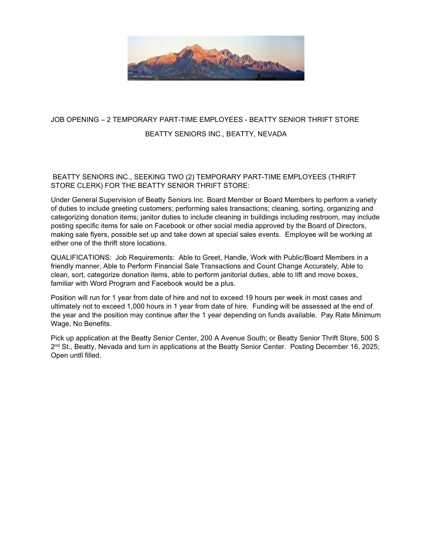 LOCAL OPENINGS: Check out the Employment Opportunities, ON SITE, at the Local Hotels, Restaurants, and other establishments in Beatty: